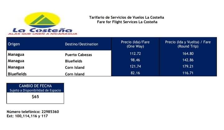 - By Plane with la Costeña airlines. Every day 2 flights Managua – Corn islands . Round trip 180$ , you can book your flight ticket by phone +505 2298 5360 using credit card, or buy at the airport, it’s cheaper than booking online. http://www.lacostena.com.ni